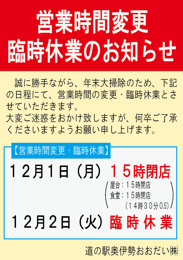 誠に勝手ながら、年末大掃除の為、下記の通り、営業時間の変更・臨時休業致します。