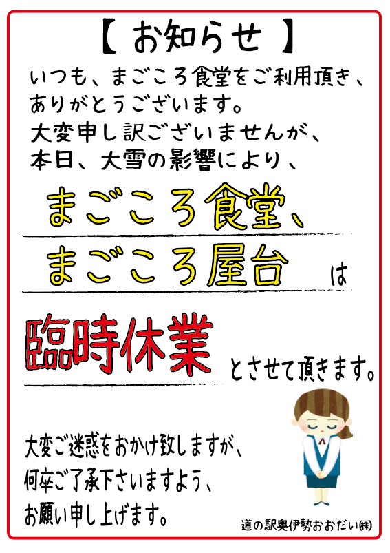 いつも「道の駅奥伊勢おおだい」をご利用頂き、誠にありがとうございます。大変申し訳ございませんが、大雪の影響により、本日、2月8日(日)、「まごころ食堂」と「まごころ屋台」は、臨時休業とさせていただきます。